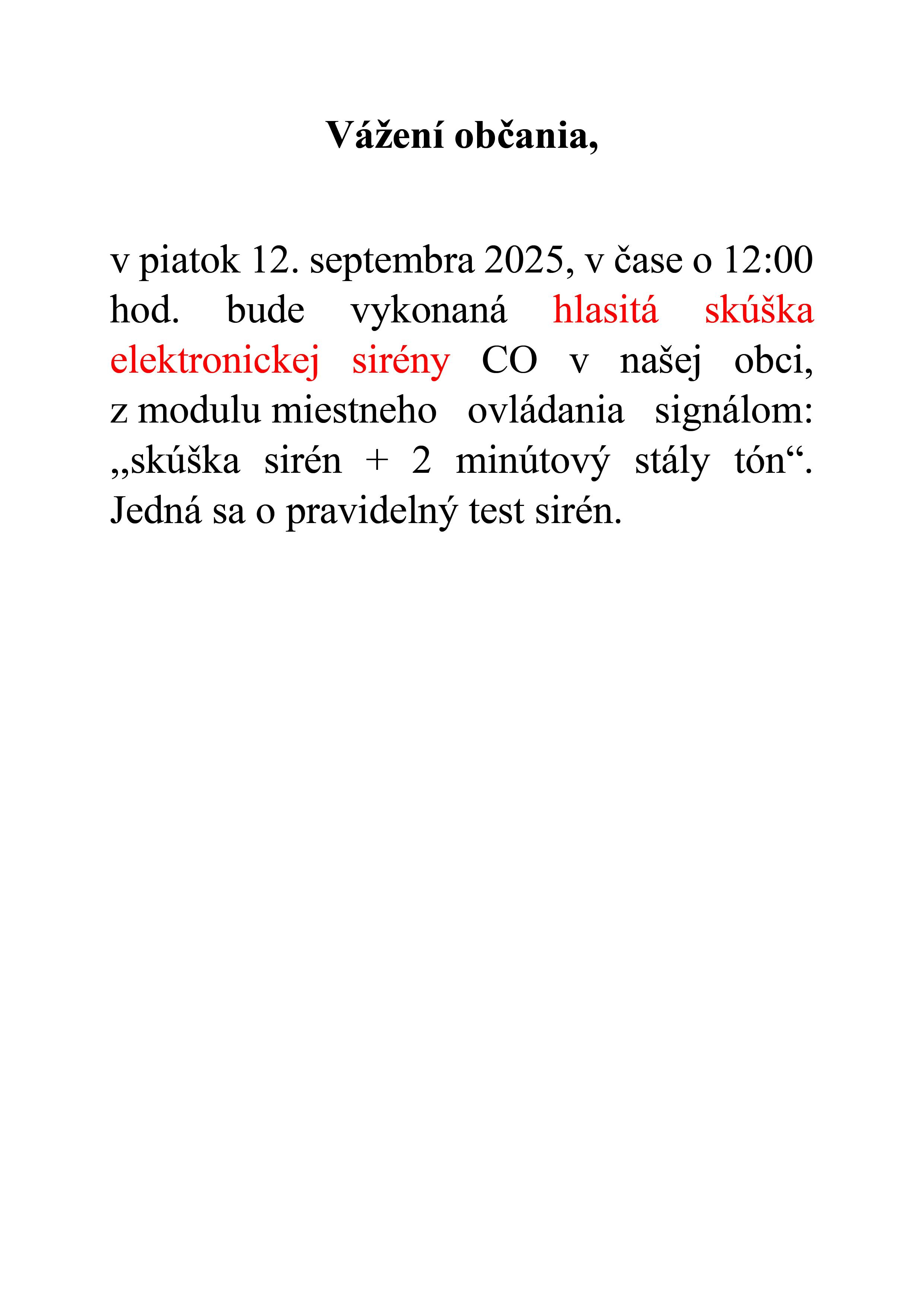 v piatok 12. septembra 2025, v čase o 12:00 hod. bude vykonaná hlasitá skúška elektronickej sirény CO v našej obci, z modulu miestneho ovládania signálom: ,,skúška sirén + 2 minútový stály tón“. Jedná sa o pravidelný test sirén.