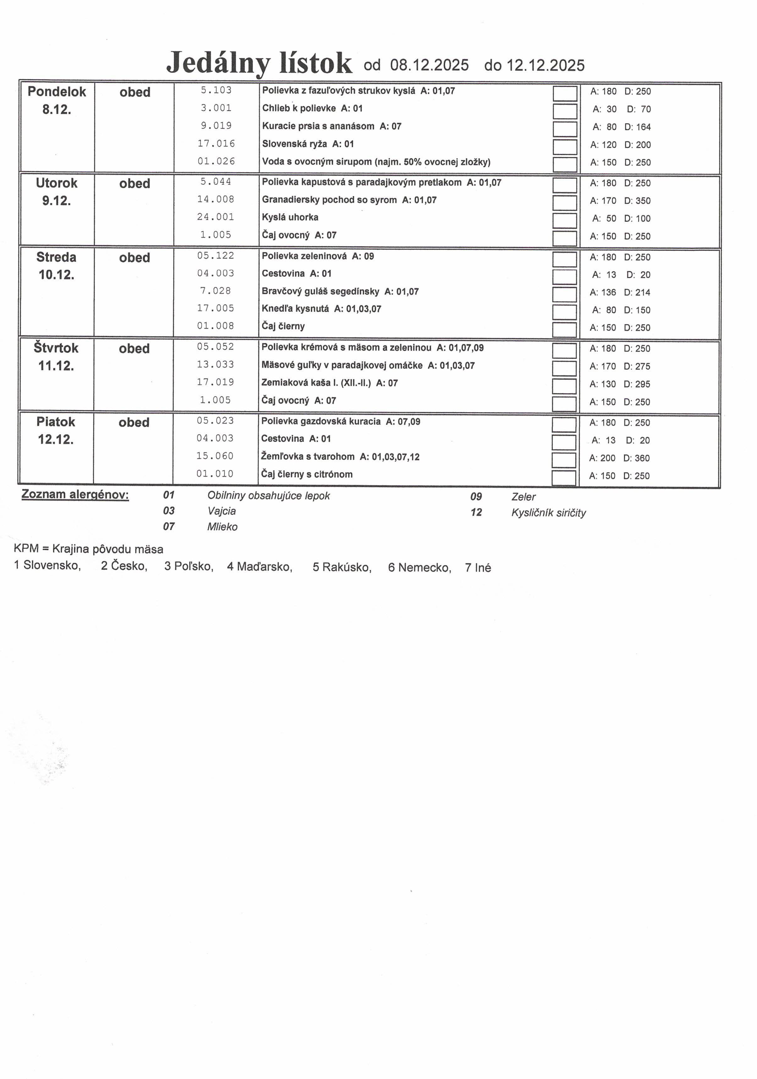 Jedálny ístok 08.12.2025 - 12.12.2025