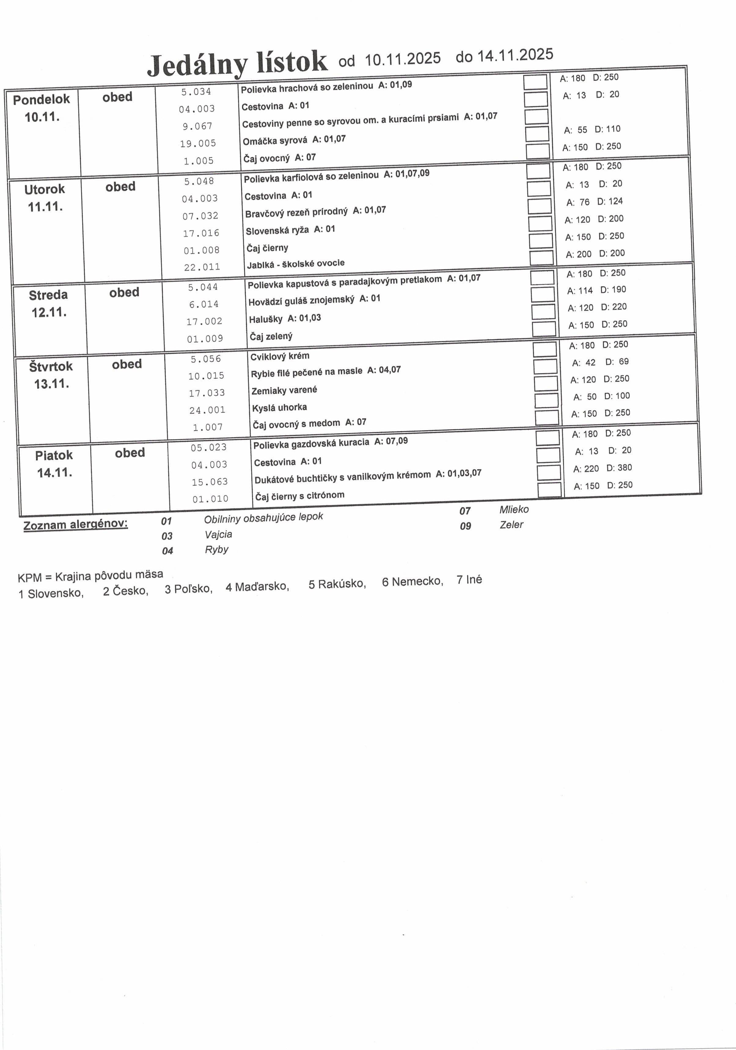 Jedálny lístok 10.11.2025 - 14.11.2025