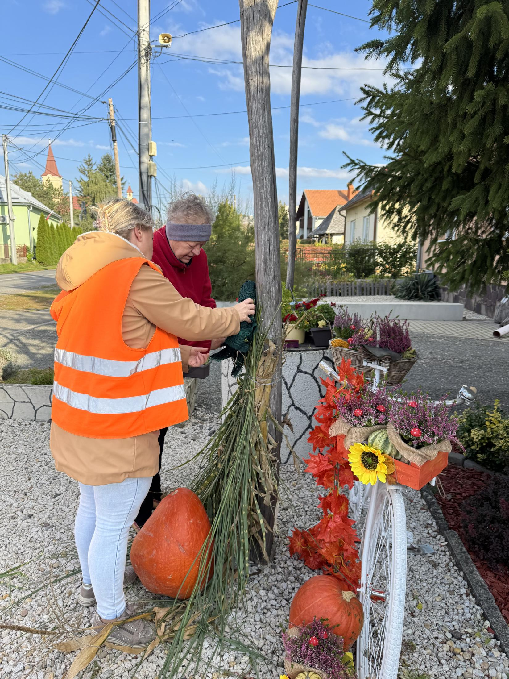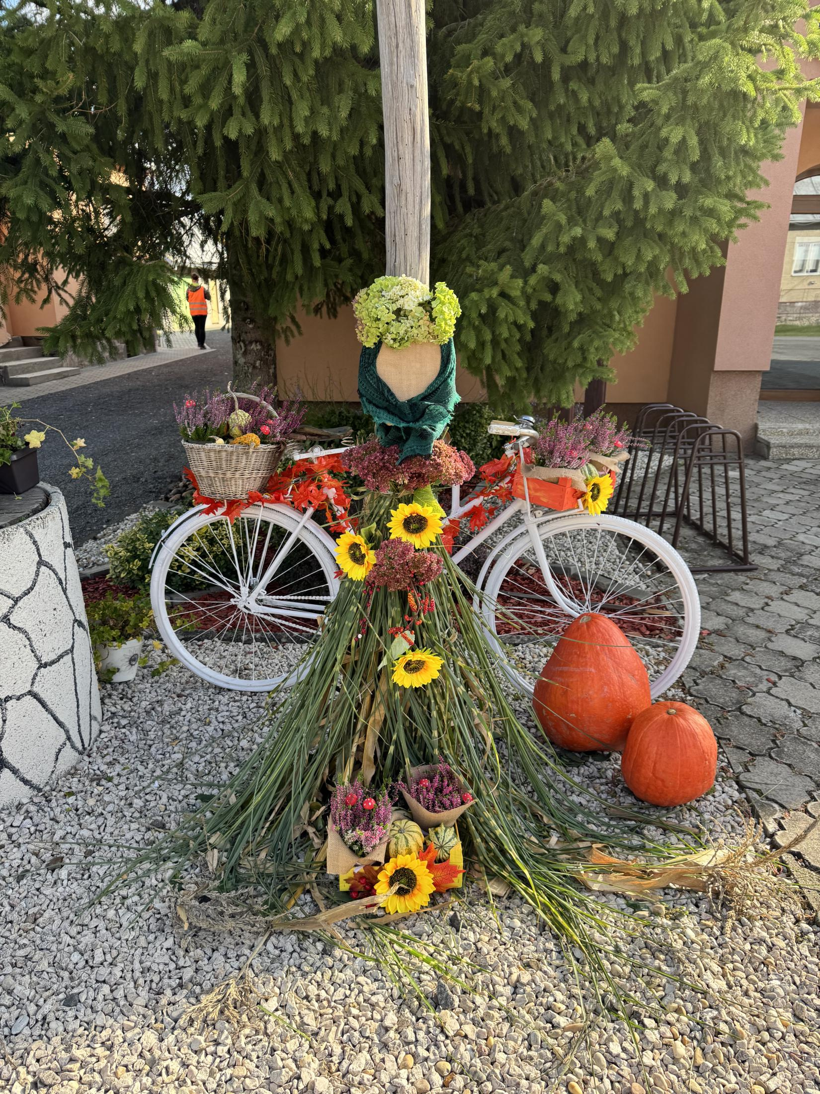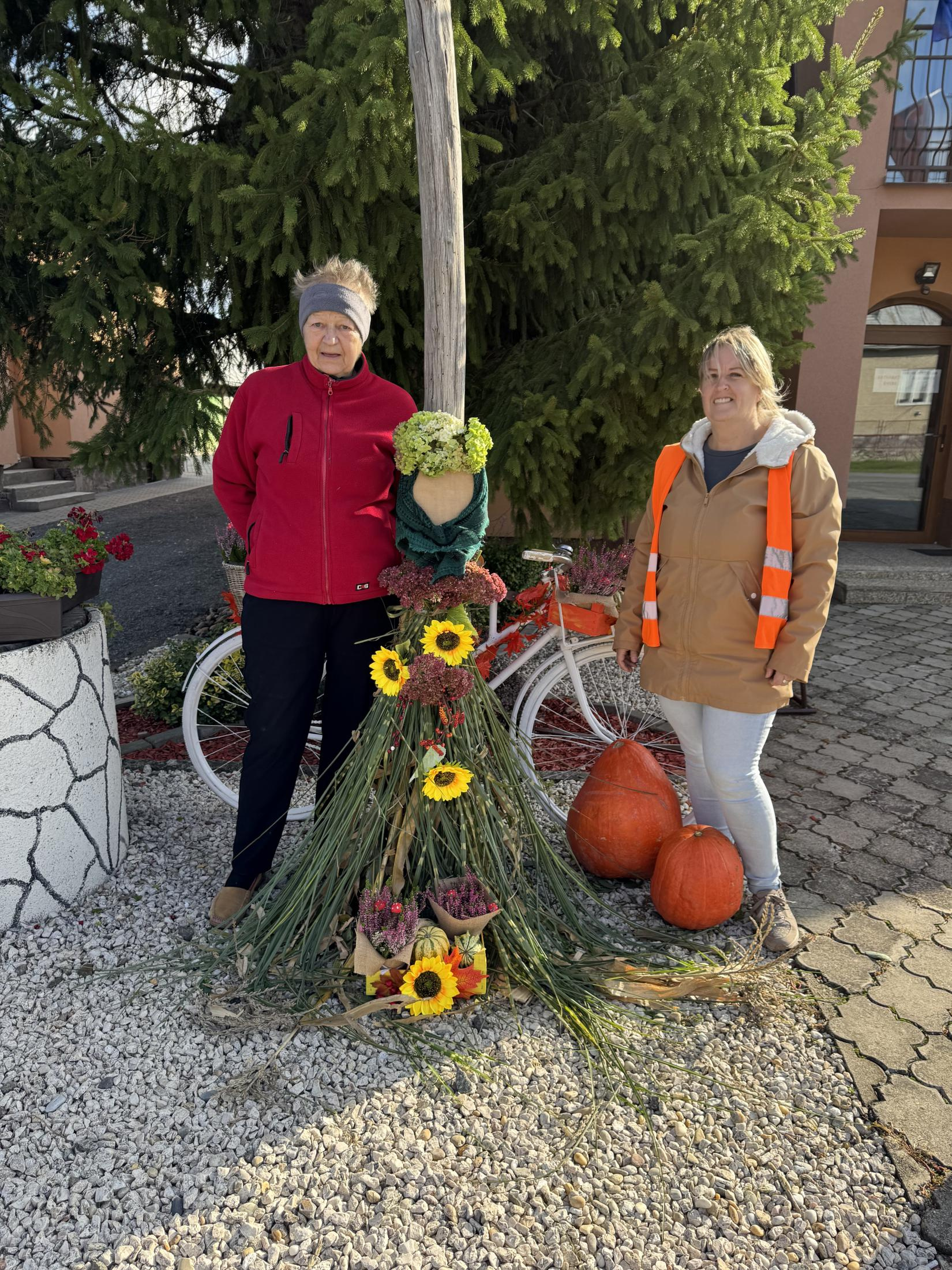 Jesenná výzdoba pred Obecným úradom a Centrom Rozvojového tímu, ktorá bola realizovaná v spolupráci s miestnou dobrovoľníčkou.
