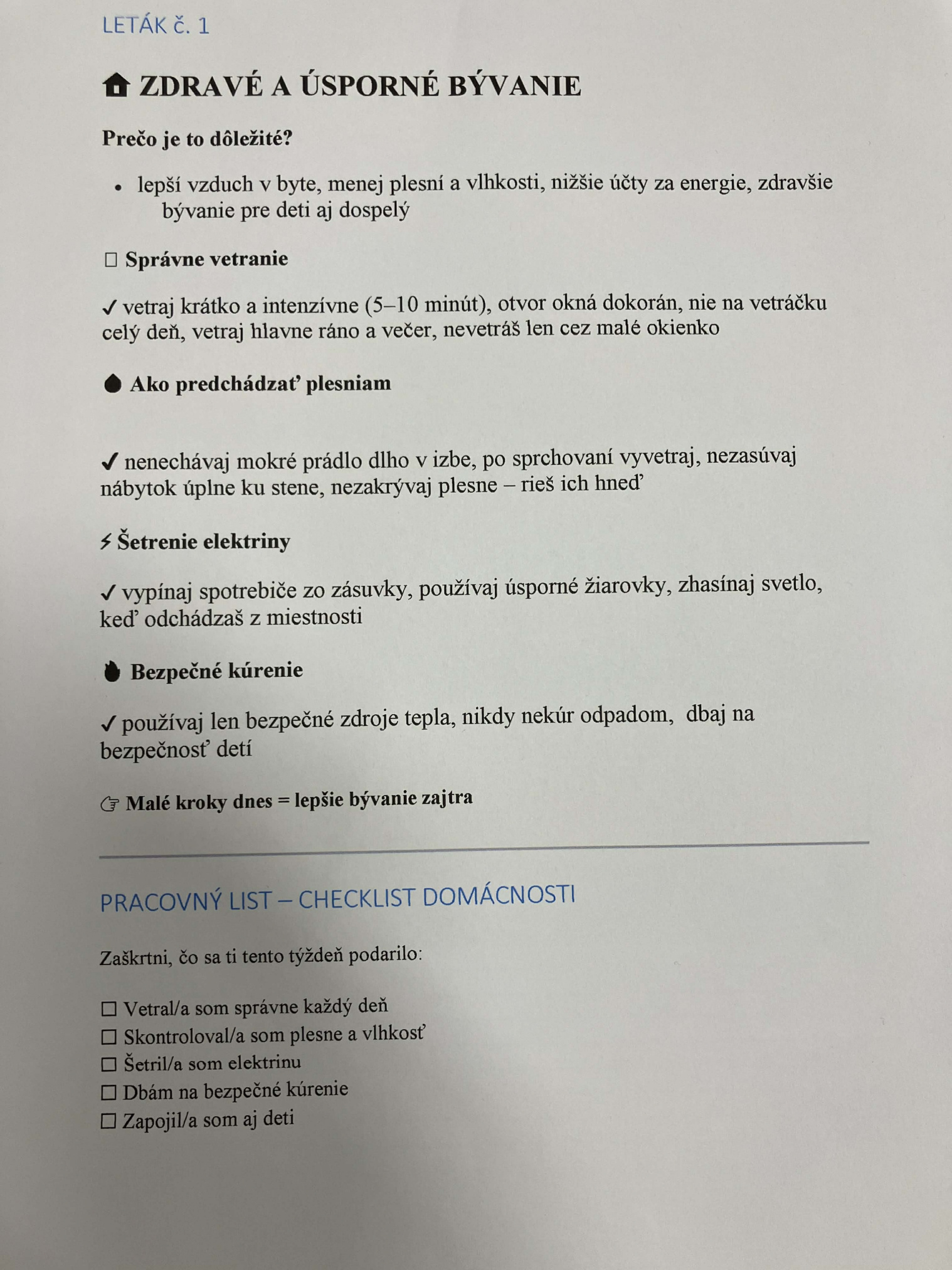Aktivita bola zameraná na informácie o správnej starostlivosti o domácnosť. Prostredníctvom informačného letáku sa oboznámili so zásadami zdravého bývania, správneho vetrania, kúrenia a šetrenia energií.