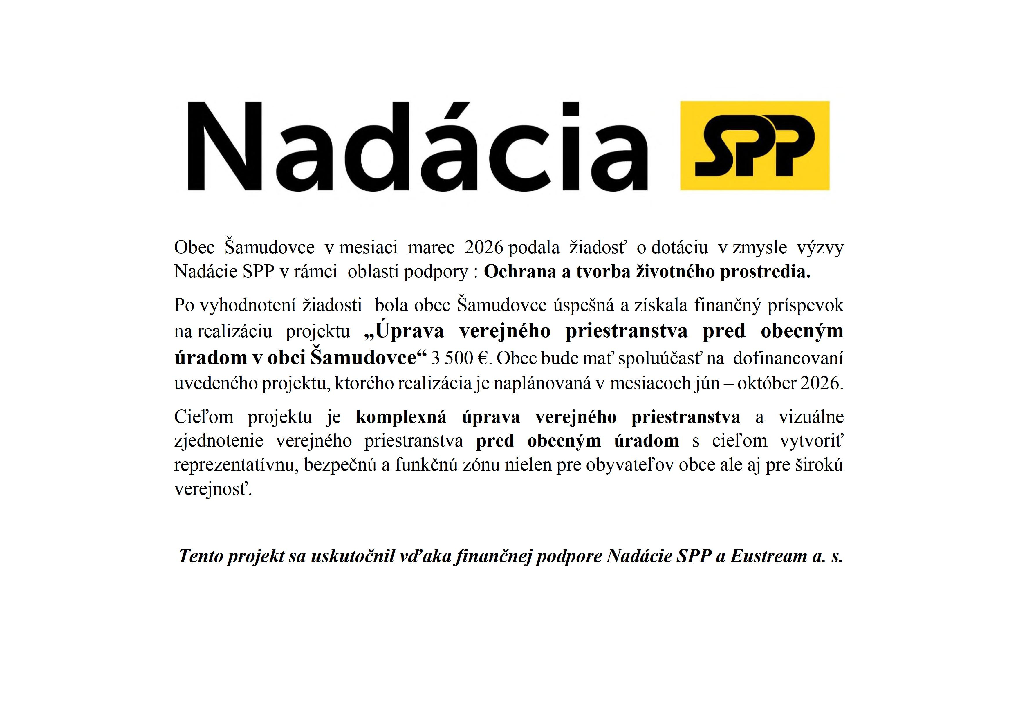 Obec Šamudovce v mesiaci marec 2026 podala žiadosť o dotáciu v zmysle výzvy Nadácie SPP v rámci oblasti podpory : Ochrana a tvorba životného prostredia. Po vyhodnotení žiadosti bola obec Šamudovce úspešná a získala finančný príspevok na realizáciu projektu „Úprava verejného priestranstva pred obecným úradom v obci Šamudovce“ 3 500 €. Obec bude mať spoluúčasť na dofinancovaní uvedeného projektu, ktorého realizácia je naplánovaná v mesiacoch jún – október 2026. Cieľom projektu je komplexná úprava verejného priestranstva a vizuálne zjednotenie verejného priestranstva pred obecným úradom s cieľom vytvoriť reprezentatívnu, bezpečnú a funkčnú zónu nielen pre obyvateľov obce ale aj pre širokú verejnosť. Tento projekt sa uskutočnil vďaka finančnej podpore Nadácie SPP a Eustream a. s.