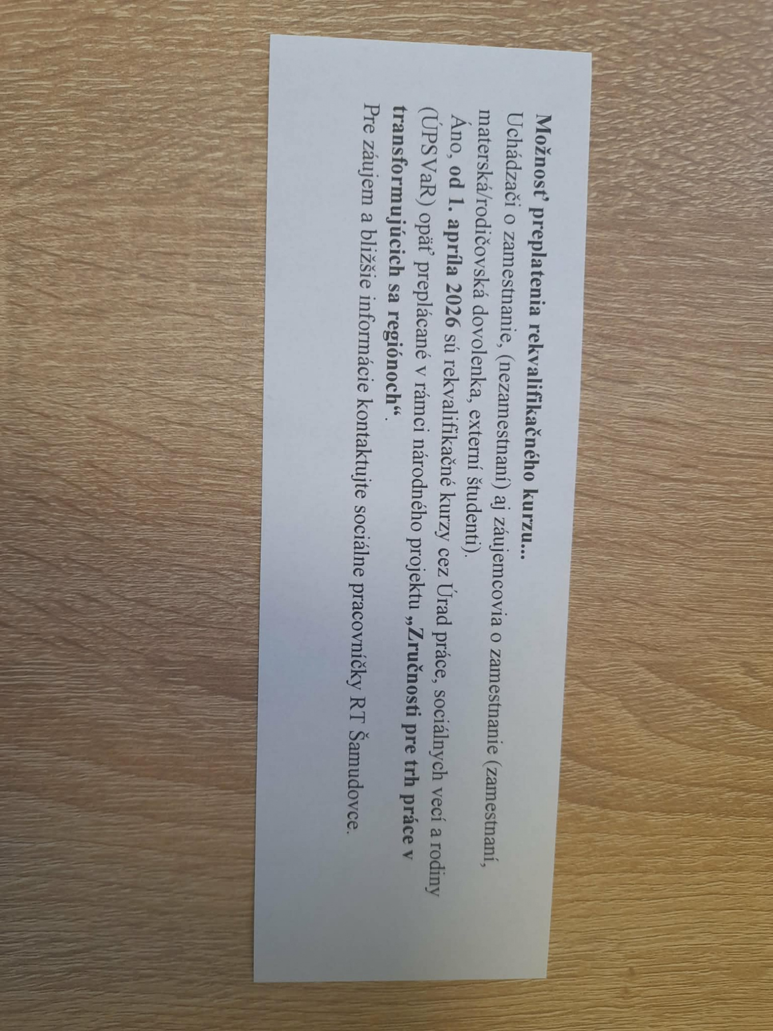 Sociálna pracovníčka informovala klientov o možnosti preplatenia rekvalifikačného kurzu... Ak ste uchádzač o zamestnanie, (nezamestnaní) alebo záujemca o zamestnanie, na materskej alebo rodičovskej dovolenke, externý študent máte možnosť cez Úrad práce, sociálnych vecí a rodiny (ÚPSVaR) preplatiť rekvalifikačný kurz v rámci národného projektu „Zručnosti pre trh práce v transformujúcich sa regiónoch“ a získať tak ľahšie nové zamestnanie. Klientom bol odovzdaný aj leták s informáciami. Pre záujem a bližšie informácie kontaktujte sociálne pracovníčky RT Šamudovce.
