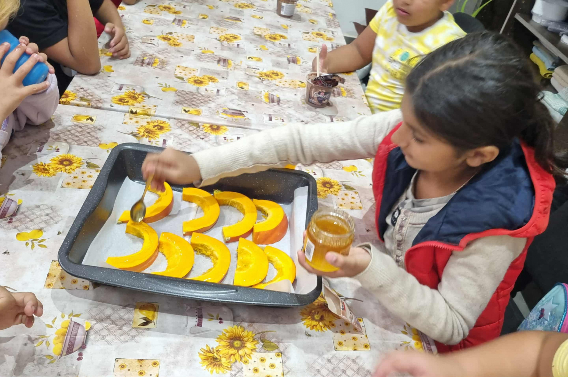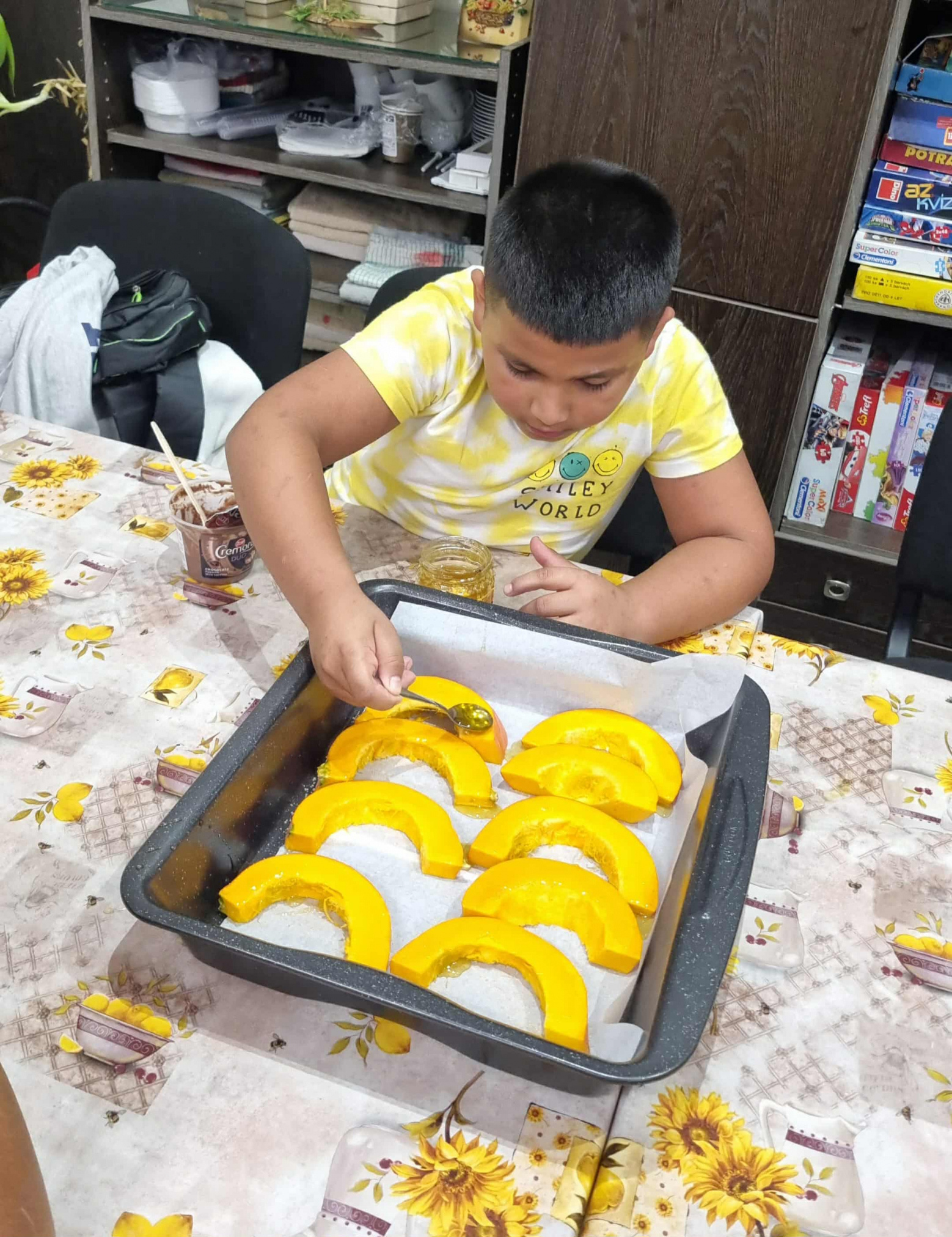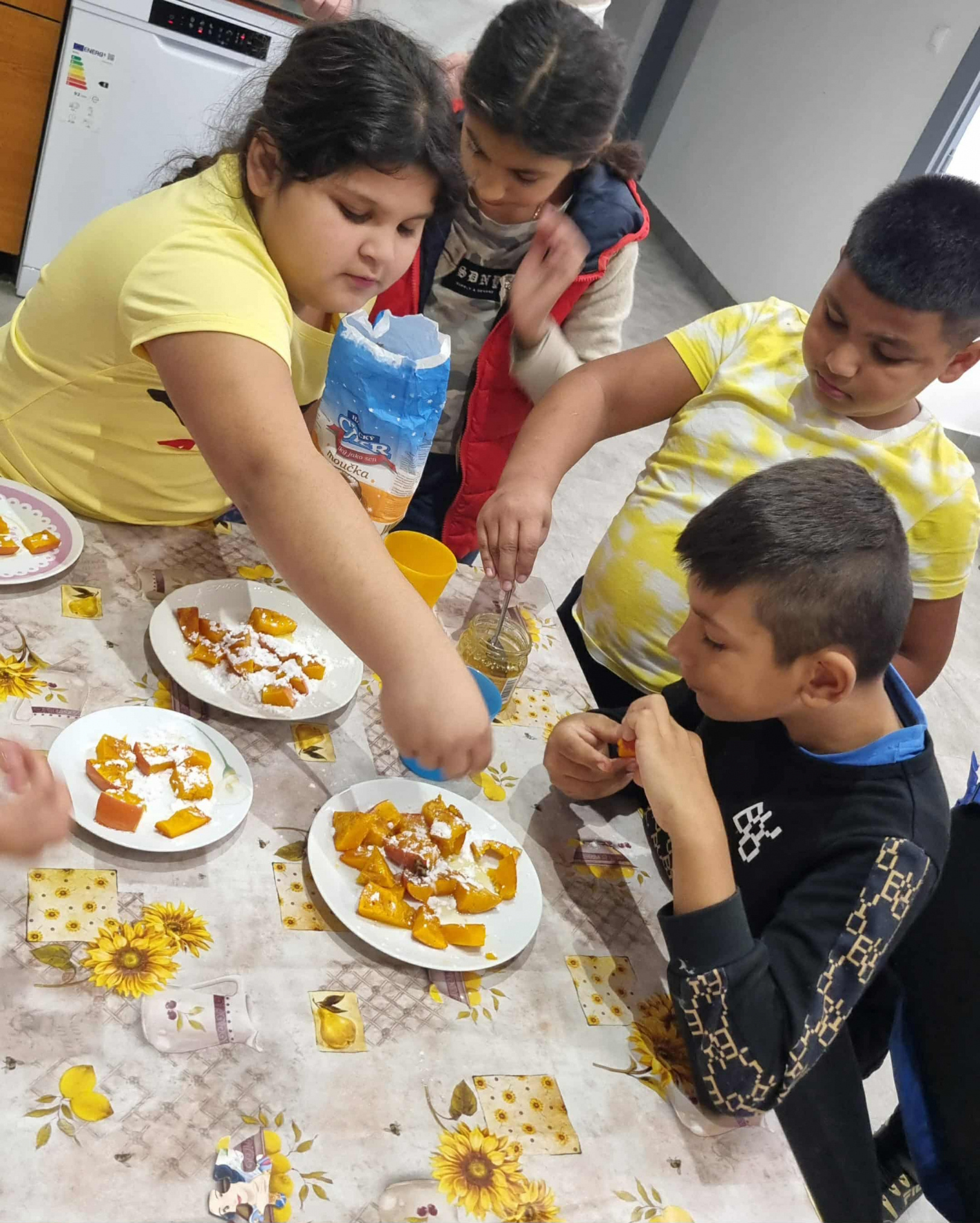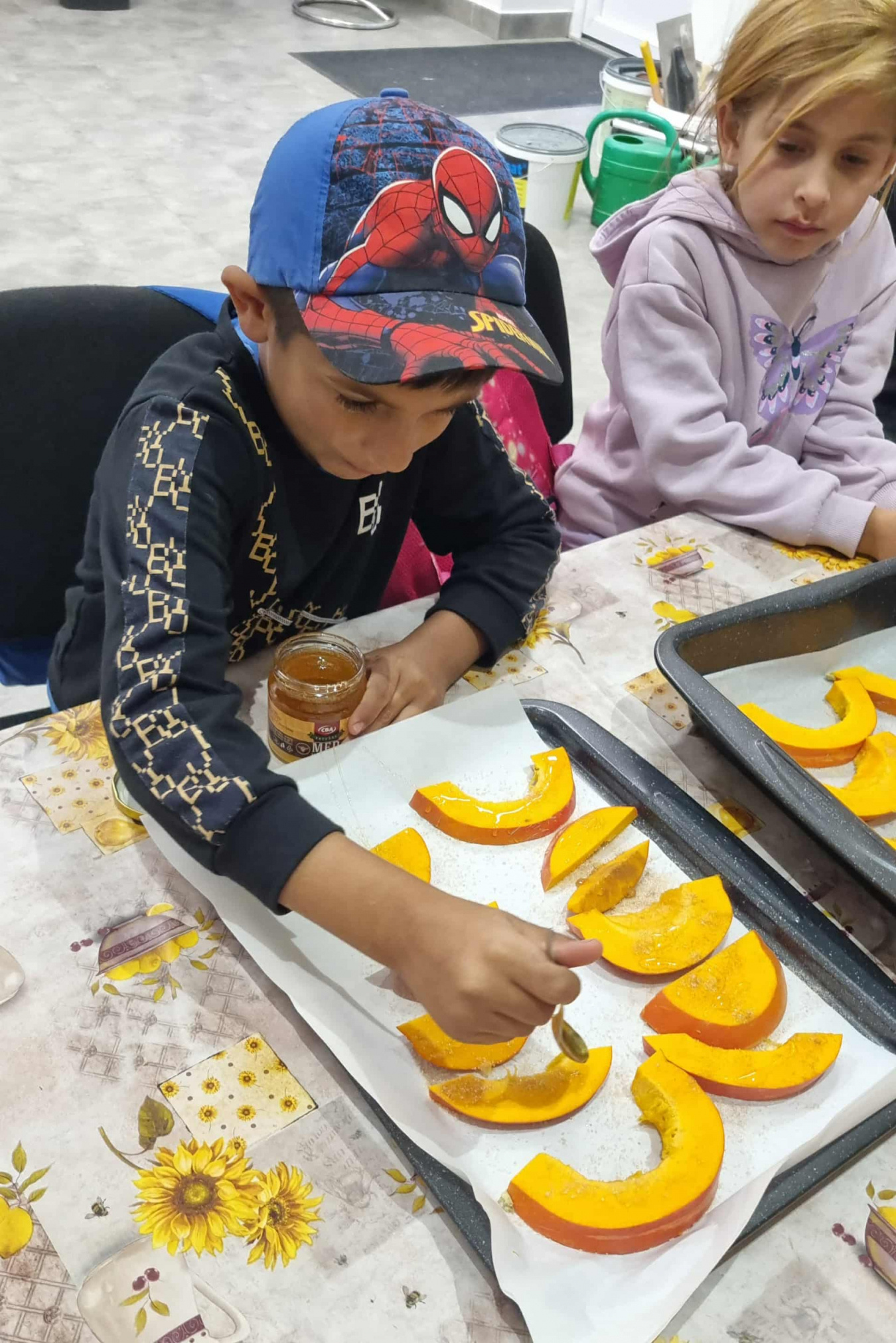 S deťmi sme si pripravili chutnú jesennú dobrotu – pečené Hokkaido s medom a škoricou. Najskôr sme si spolu prezreli krásnu oranžovú tekvicu. Potom sme ju spoločne porezali na mesiačiky. Na pripravený plech s papierom na pečenie sme mesiačiky poukladali do radov. Deti ich potom posypali voňavou škoricou a poliali medom. Nakoniec sme ich dali zapiecť do rúry, kým neboli krásne mäkké a zlatisté. Cieľom tejto aktivity rozvíjať praktické zručnosti detí pri príprave jednoduchého jedla.