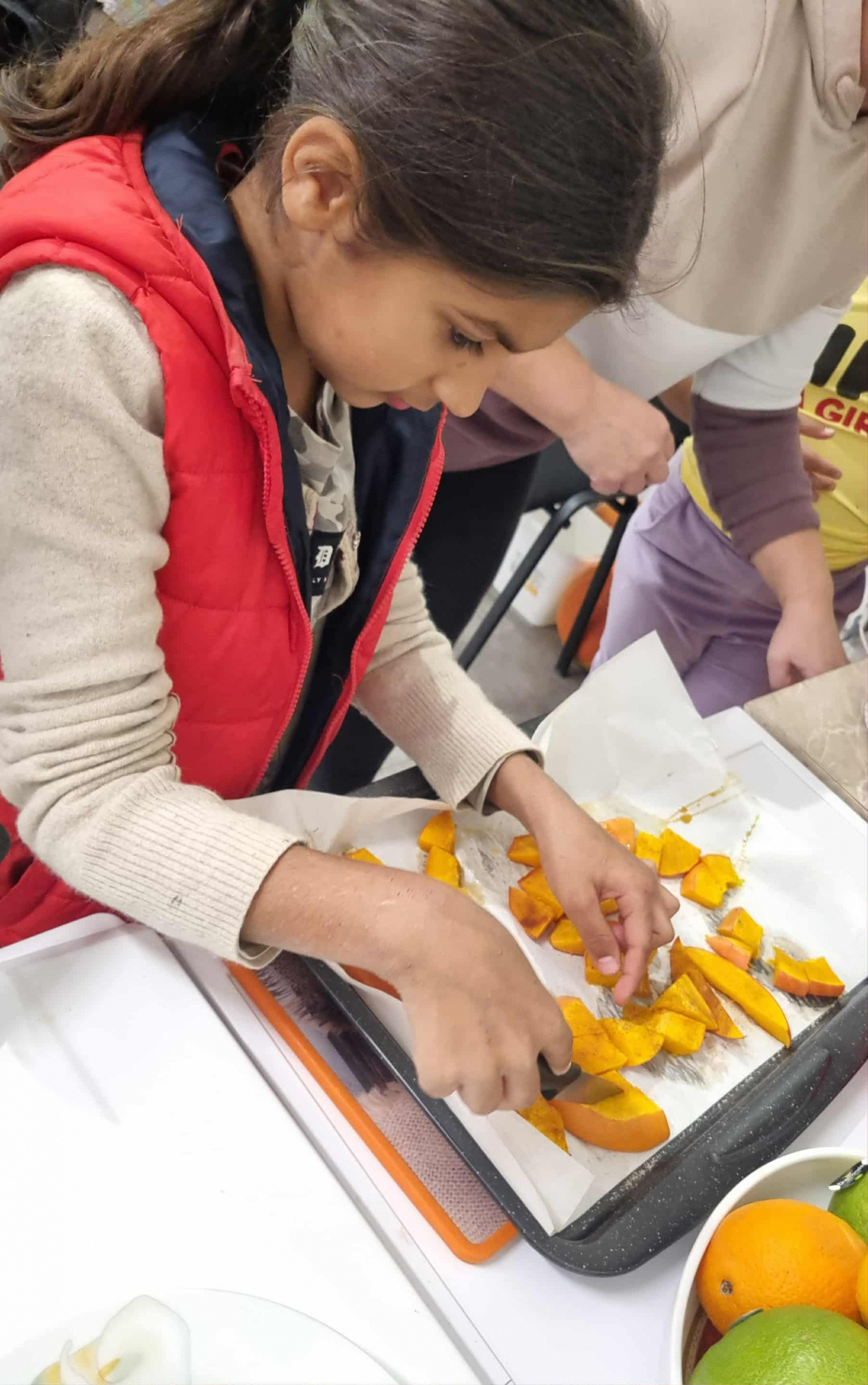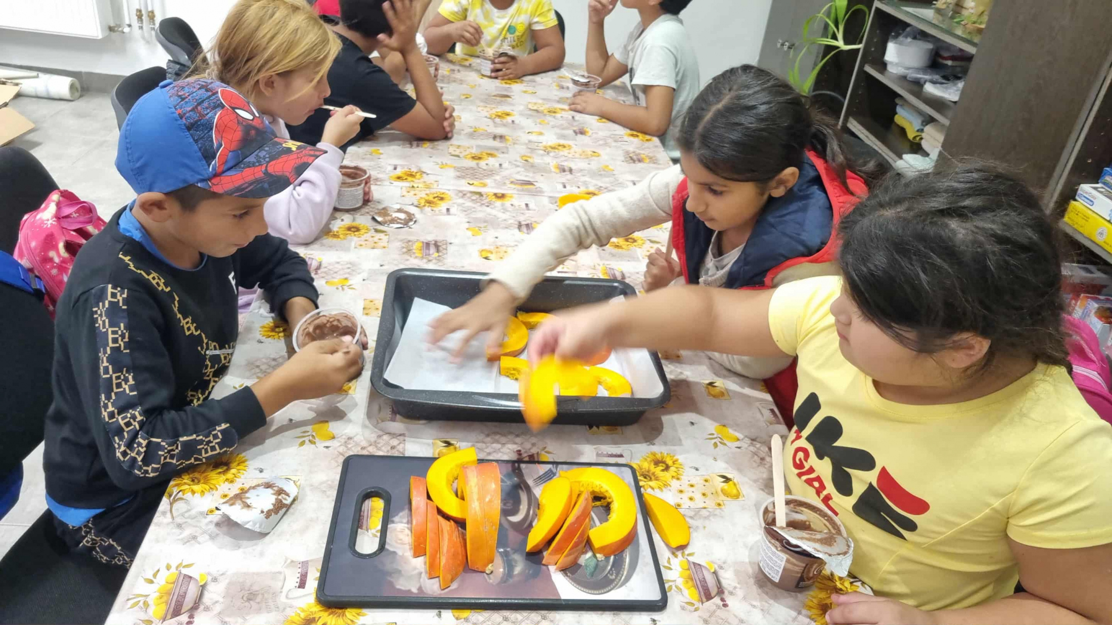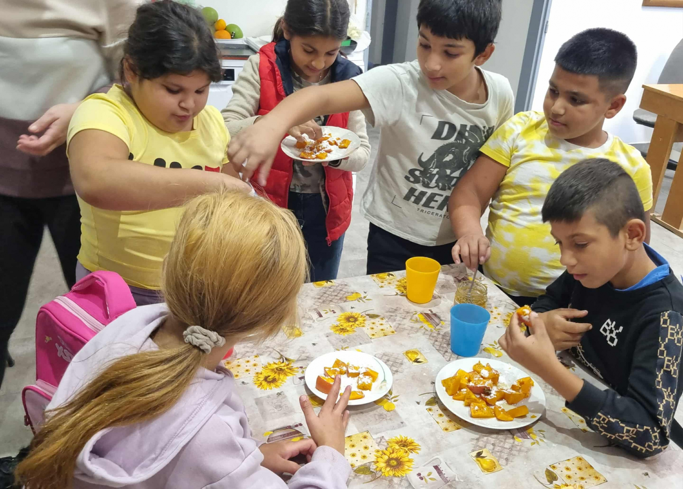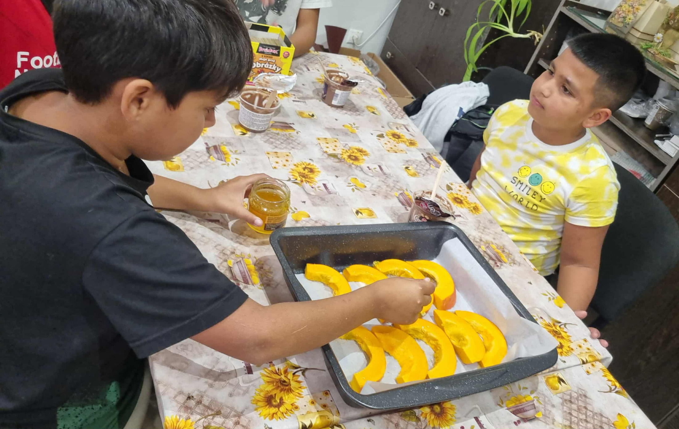 S deťmi sme si pripravili chutnú jesennú dobrotu – pečené Hokkaido s medom a škoricou. Najskôr sme si spolu prezreli krásnu oranžovú tekvicu. Potom sme ju spoločne porezali na mesiačiky. Na pripravený plech s papierom na pečenie sme mesiačiky poukladali do radov. Deti ich potom posypali voňavou škoricou a poliali medom. Nakoniec sme ich dali zapiecť do rúry, kým neboli krásne mäkké a zlatisté. Cieľom tejto aktivity rozvíjať praktické zručnosti detí pri príprave jednoduchého jedla.