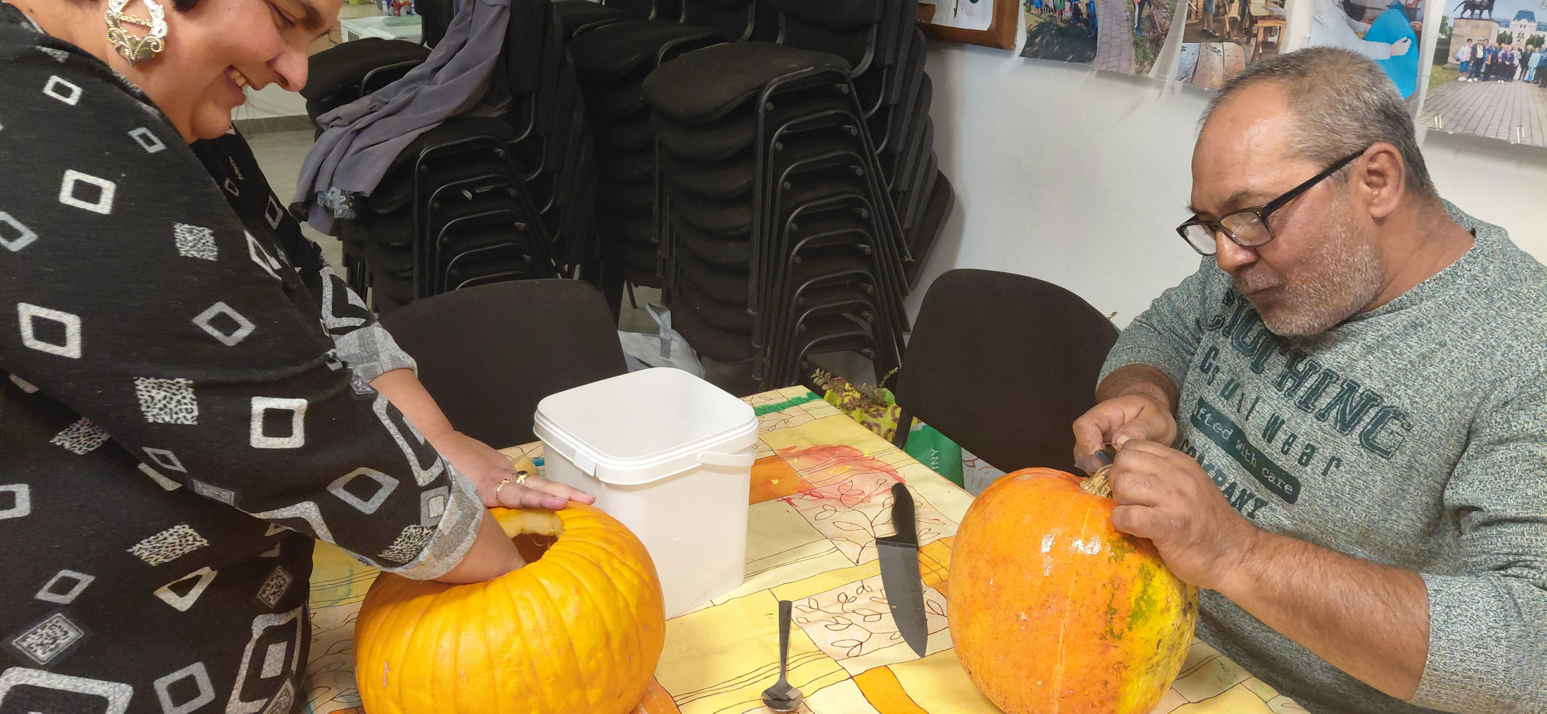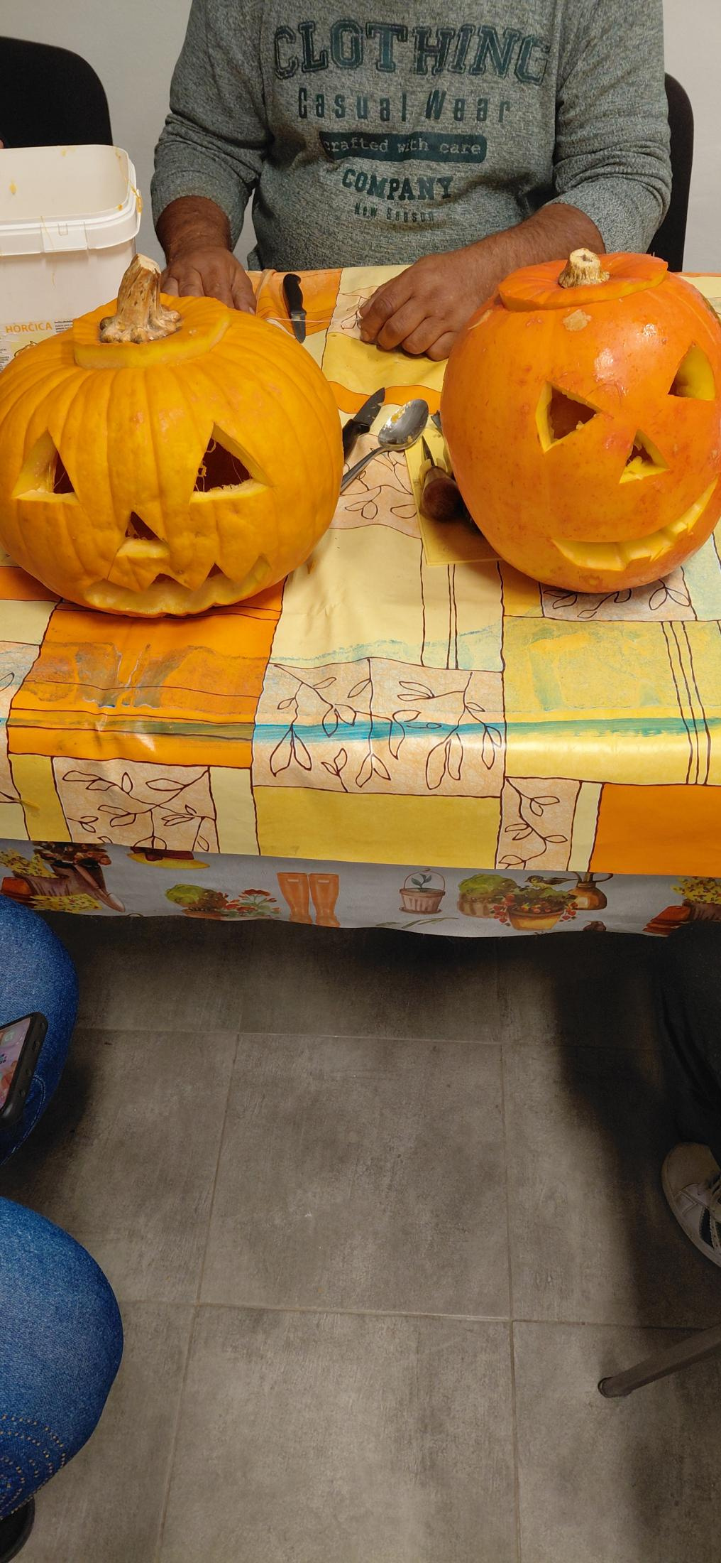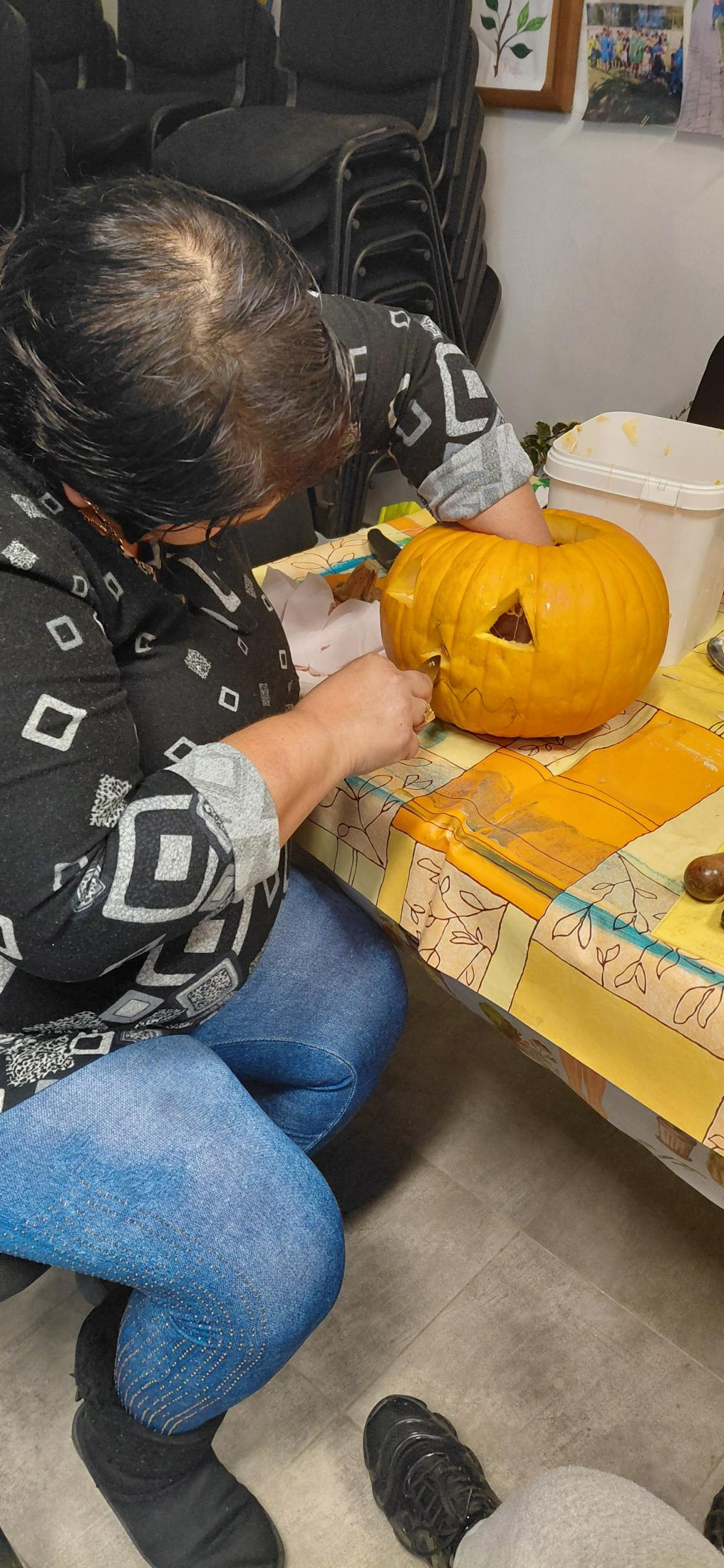 Asistent pre bývanie spolu s obyvateľkou obce sa zapojili do jesennej tvorivej aktivity – vyrezávanie tekvíc. Spoločne si pripravili tekvicu, navrhli motív a postupne ju vyrezali do tvaru tradičnej „ halloweenskej „ dekorácie. Výsledkom bola originálne vyzdobená tekvica, ktorá skrášlila priestor počas jesenného obdobia.