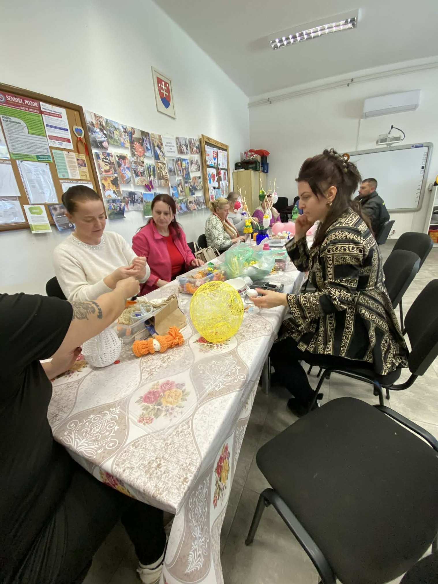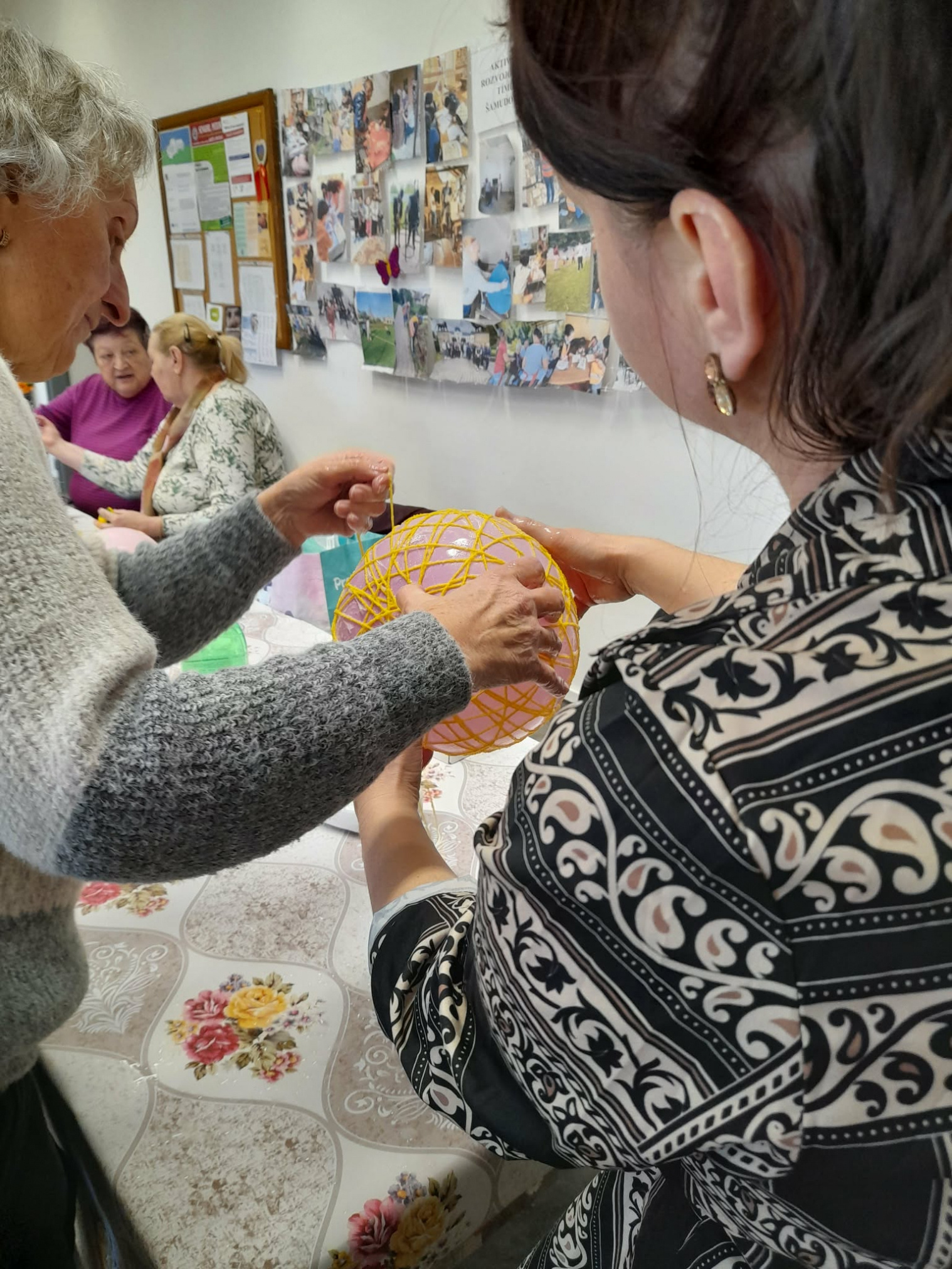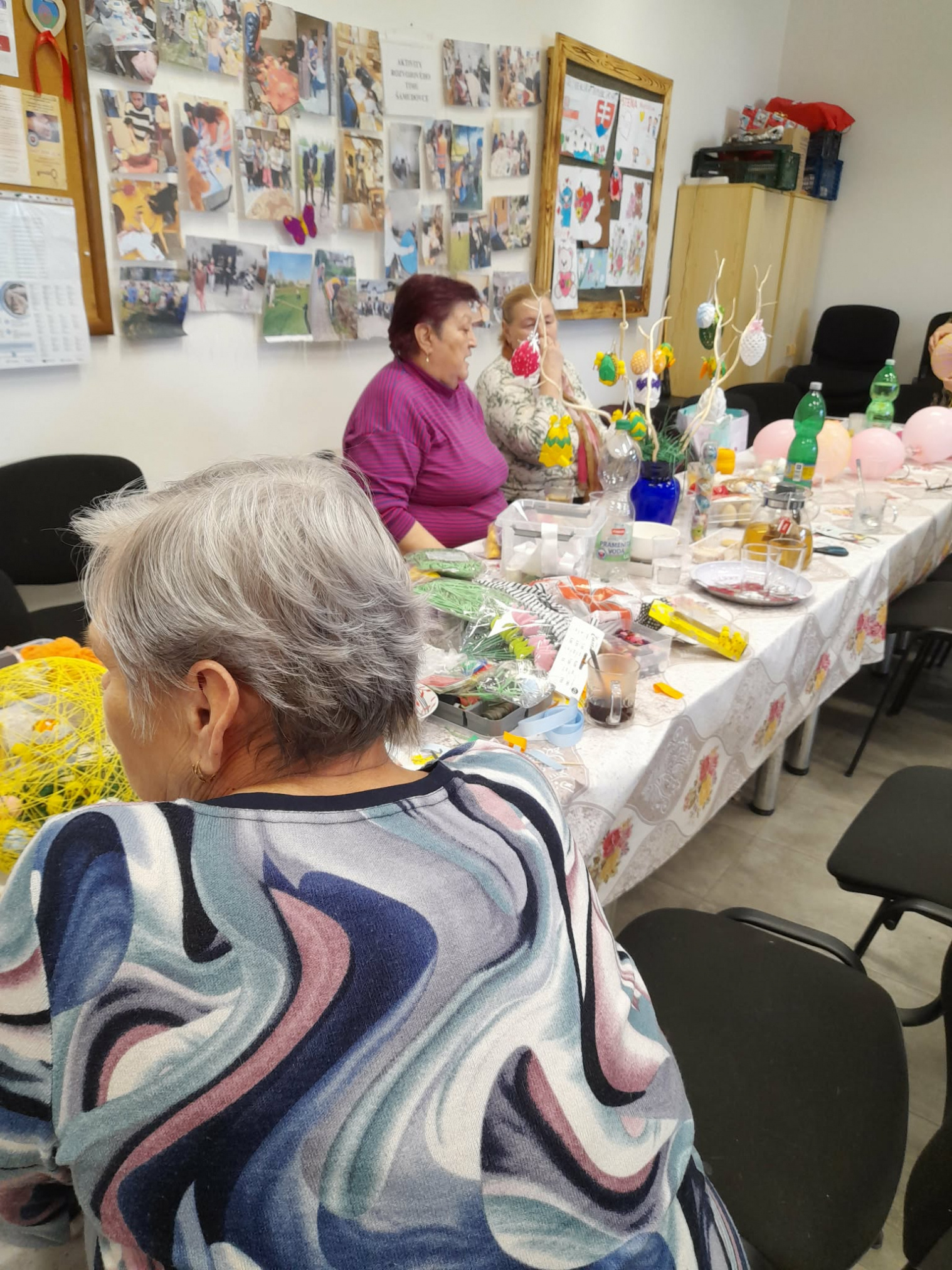Sociálne pracovníčky spolu so seniormi trávili popoludnie zdobením veľkonočných vajíčok. Seniorka Mirka ukazovala ostatným seniorom techniku patchwork (je to texilná technika, kde sa spájajú rôzne kúsky látok do geometrických obrazcov) a vyskúšali si i spoločne omotanie balóna bavlnou namočenou v škrobe a vytvorili krásnu veľkonočnú dekoráciu na stôl. Svojou návštevou nás potešil aj pán starosta obce. Všetci sme sa spoločne stretli, porozprávali, pozdieľali sa a vytvorili krásne veľkonočné dekorácie. Veď posúďte sami...