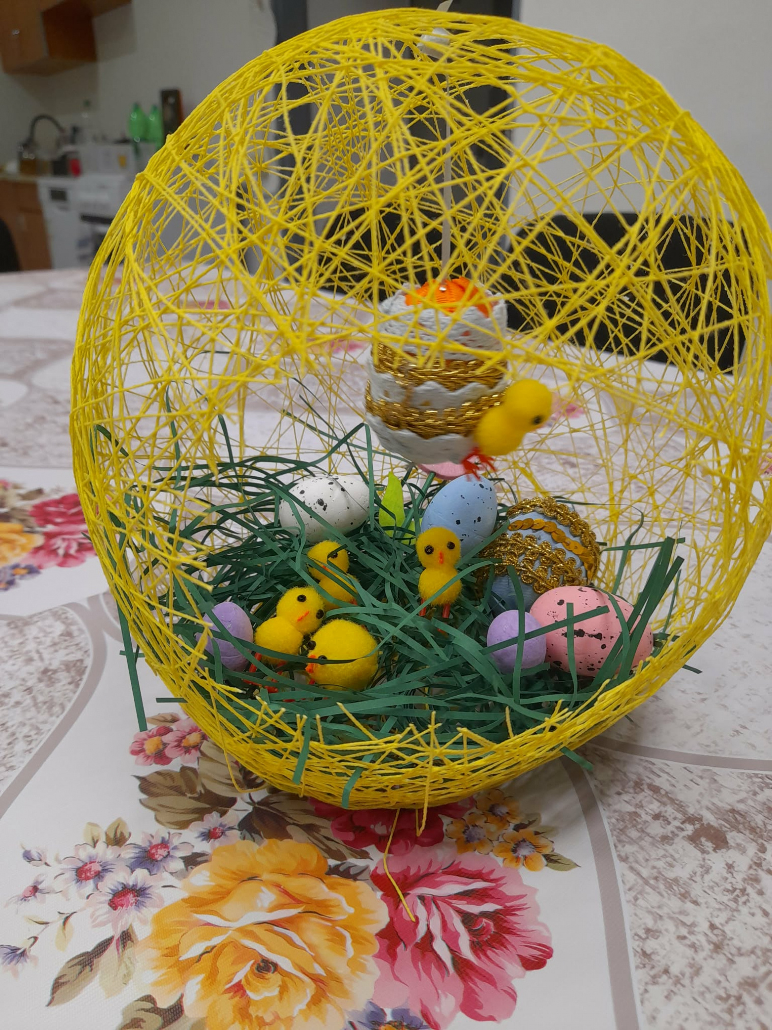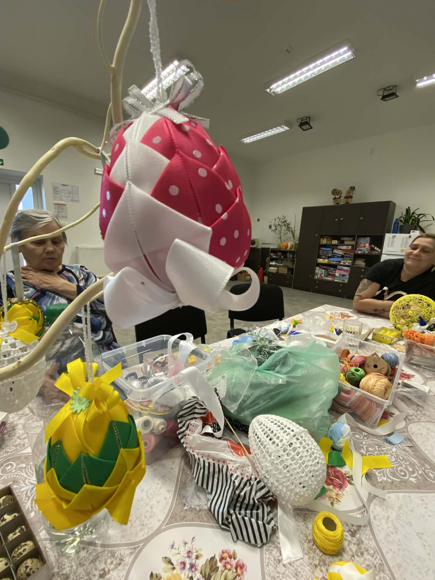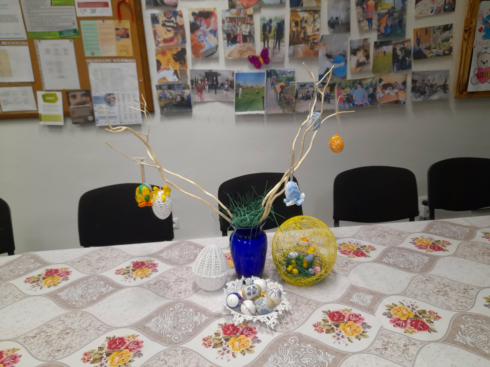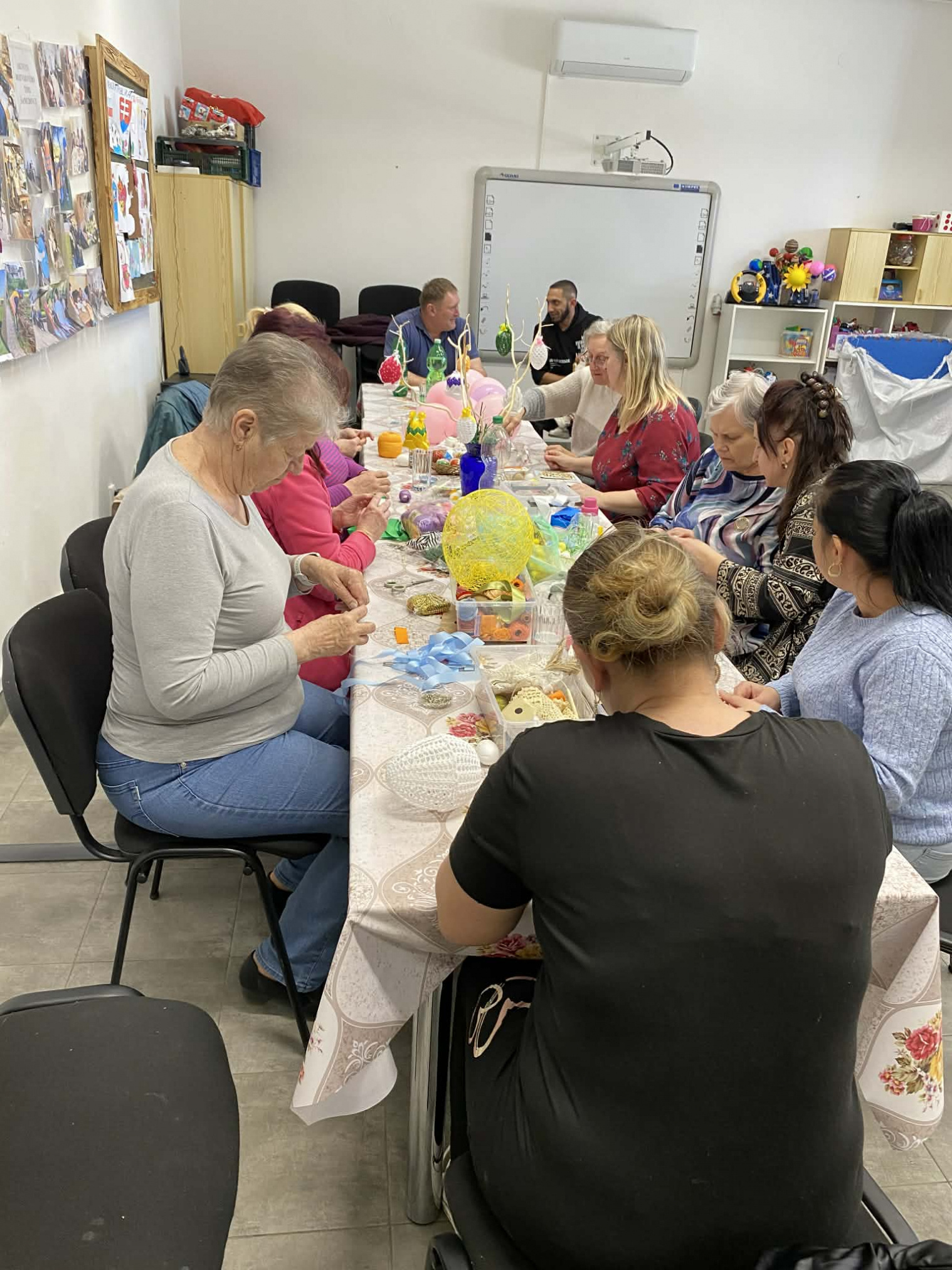 Sociálne pracovníčky spolu so seniormi trávili popoludnie zdobením veľkonočných vajíčok. Seniorka Mirka ukazovala ostatným seniorom techniku patchwork (je to texilná technika, kde sa spájajú rôzne kúsky látok do geometrických obrazcov) a vyskúšali si i spoločne omotanie balóna bavlnou namočenou v škrobe a vytvorili krásnu veľkonočnú dekoráciu na stôl. Svojou návštevou nás potešil aj pán starosta obce. Všetci sme sa spoločne stretli, porozprávali, pozdieľali sa a vytvorili krásne veľkonočné dekorácie. Veď posúďte sami...